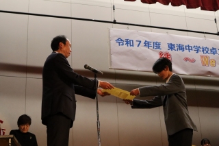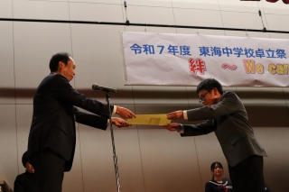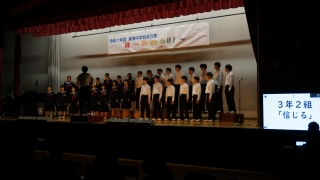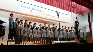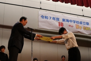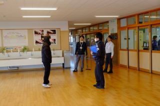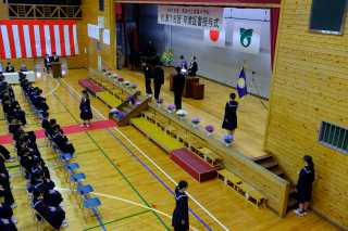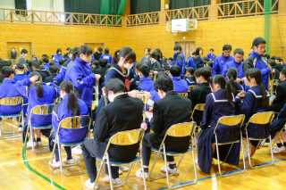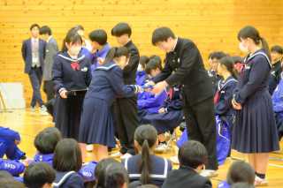 | 6校時に新人戦の壮行会を行いました。選手全体として返事や態度が凛々しく、代表生徒の言葉もしっかりしており、大変すばらしかったです。3年生の前部長からの励ましのメッセージも心に響くものでした。選手の皆さんの健闘を祈ります。 | |
