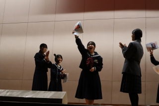 | 下校時の昇降口前で、薬物乱用防止キャンペーンが行われました。生徒会役員も参加しました! | |