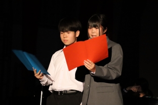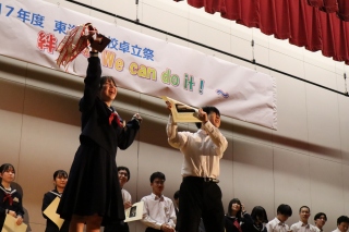 | 体育館で、東関東大会にすすんだ吹奏楽部の演奏、県大会まですすんだ英語プレゼンテーションフォーラム・チームの発表を聞いた後、オンラインで始業式を行いました。 | |