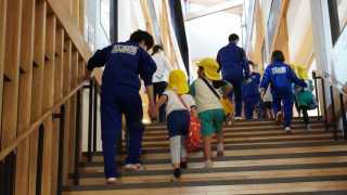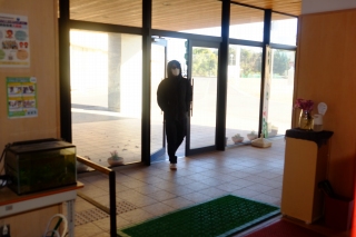 | 職員玄関から不審者が侵入したという設定での避難訓練が行われました。 | |