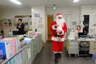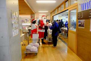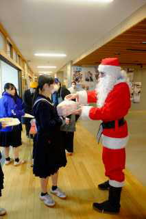 給食の時間に(登下校時も!)AETの JP先生がサンタ服で登場! 給食時にクリスマス・プレゼントを届けてくださいました! |